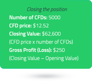 Two weeks later, shares in company XYZ have increased and are now selling at $12.52. You decide to realise your gain by Closing Out your CFD position.
